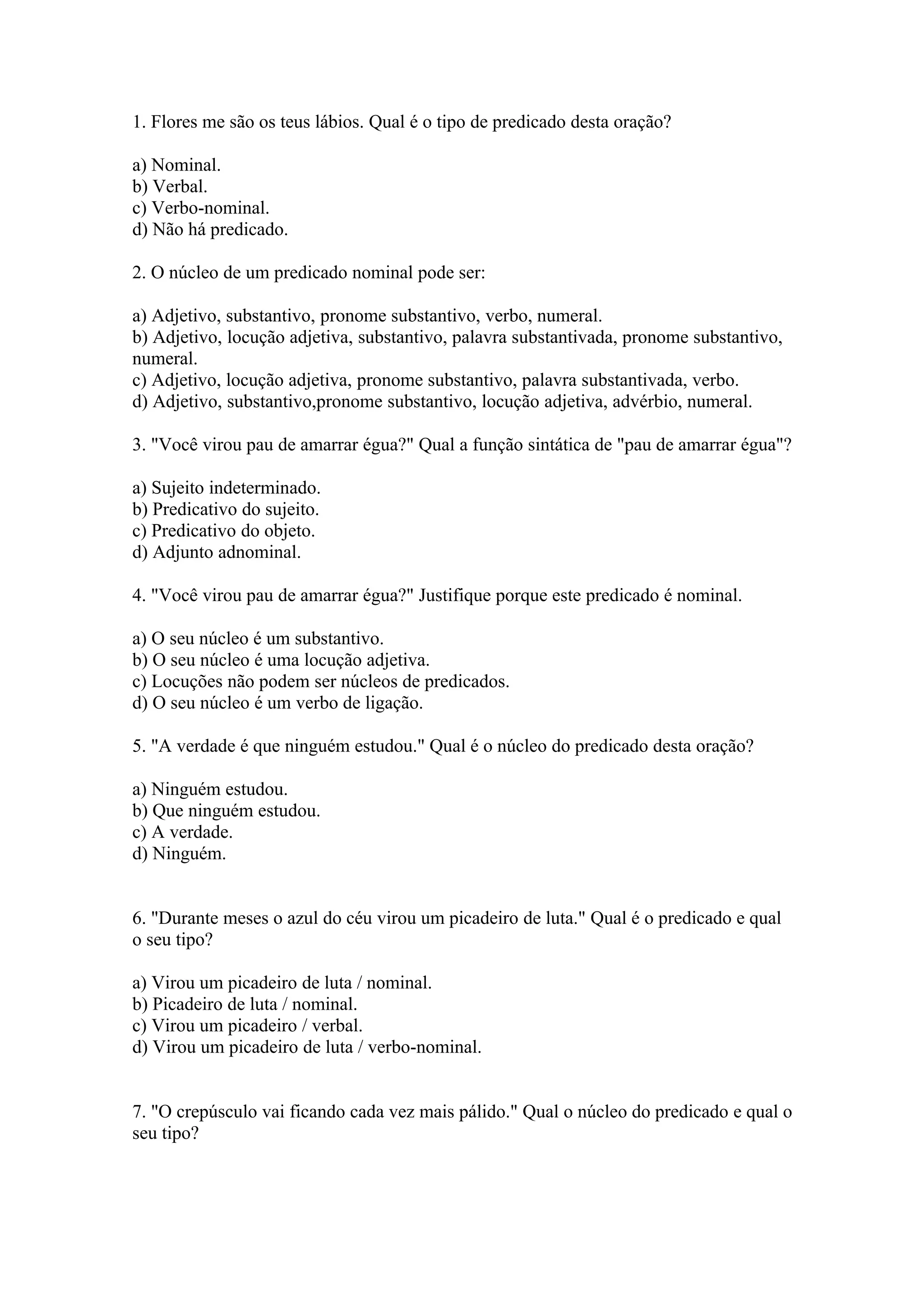 2) As perguntas abordam conceitos como núcleo do predicado, função sintática de elementos da oração, e identificação de tipos de predicados.
