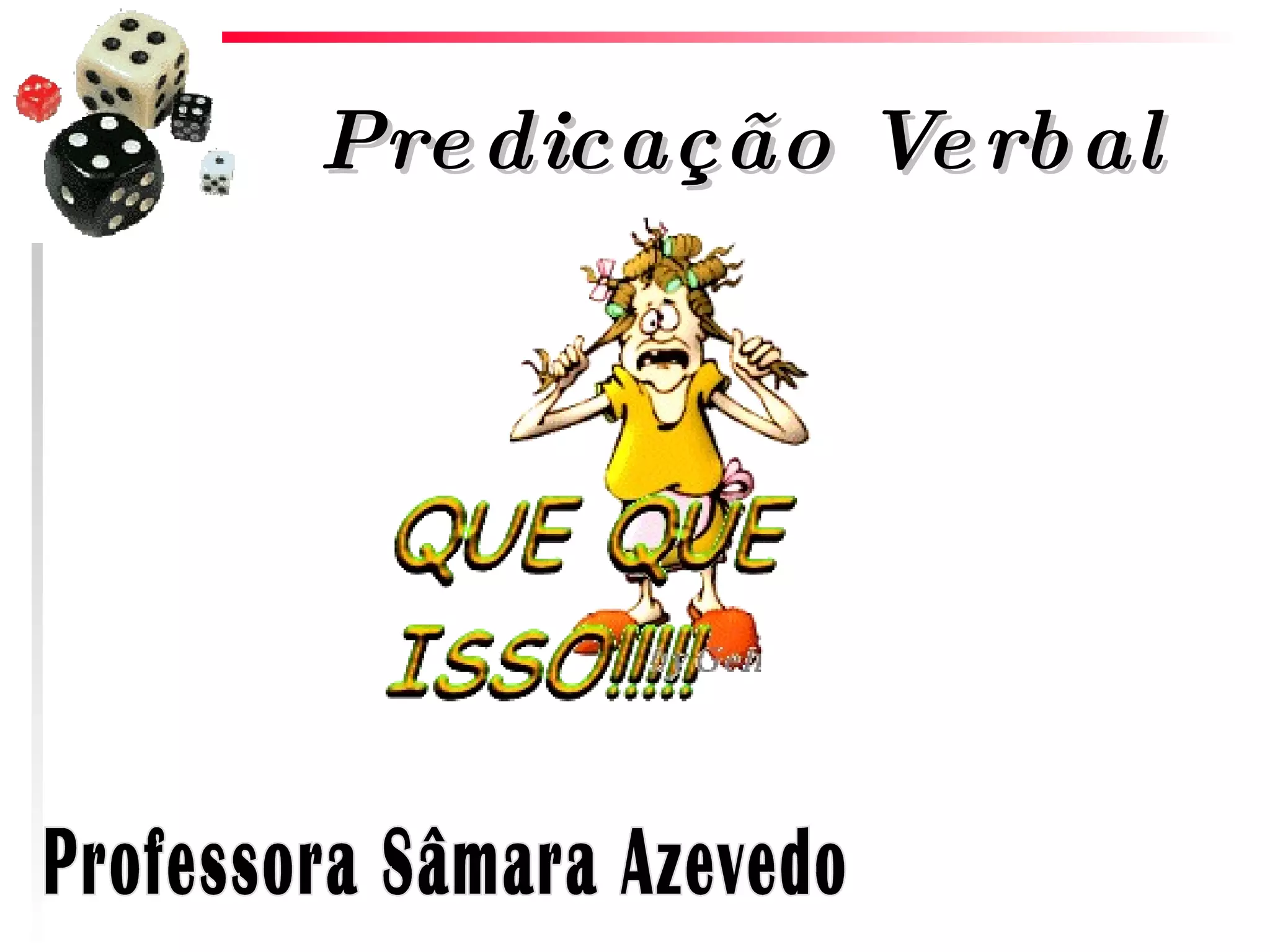 O documento discute os tipos de predicação verbal: transitiva, intransitiva e de ligação. A predicação transitiva inclui verbos transitivos diretos, indiretos e diretos e indiretos. Verbos intransitivos não exigem complemento. Verbos de ligação estabelecem relações entre atributos e sujeitos, indicando estados ou mudanças de estado.