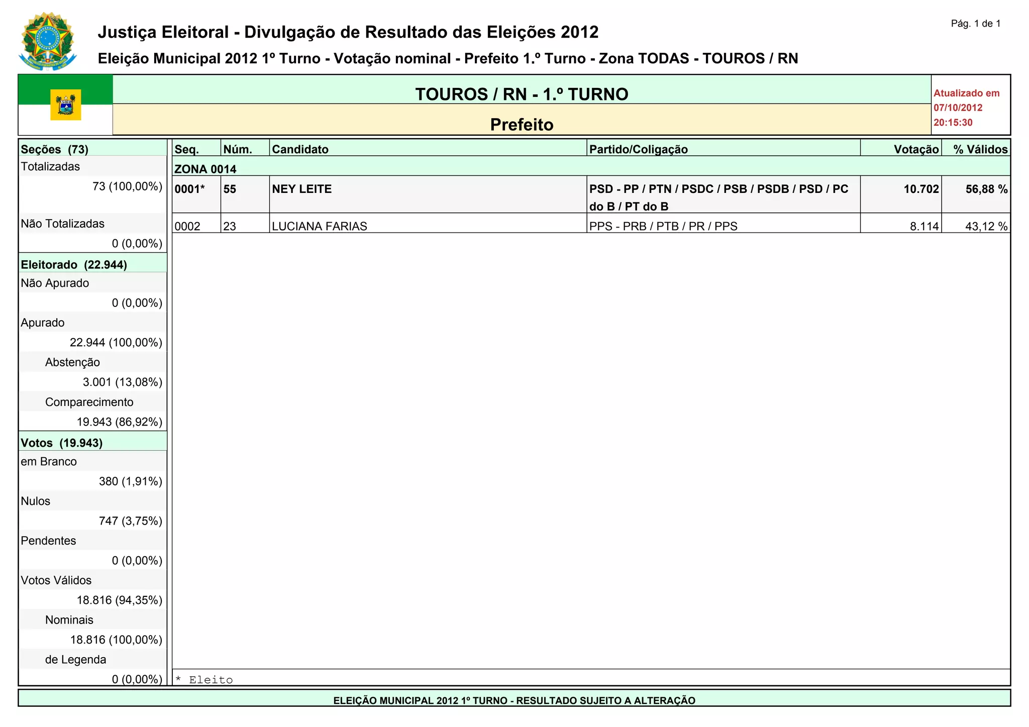 Este documento apresenta os resultados do primeiro turno da eleição municipal de 2012 para prefeito na cidade de Touros, Rio Grande do Norte. Nele Ney Leite, do PSD, recebeu 10.702 votos, o que corresponde a 56,88% dos votos válidos, e foi eleito prefeito no primeiro turno. A outra candidata, Luciana Farias, do PPS, recebeu 8.114 votos, equivalentes a 43,12% dos votos válidos. O documento detalha ainda os números de eleitores, votos brancos, nulos e