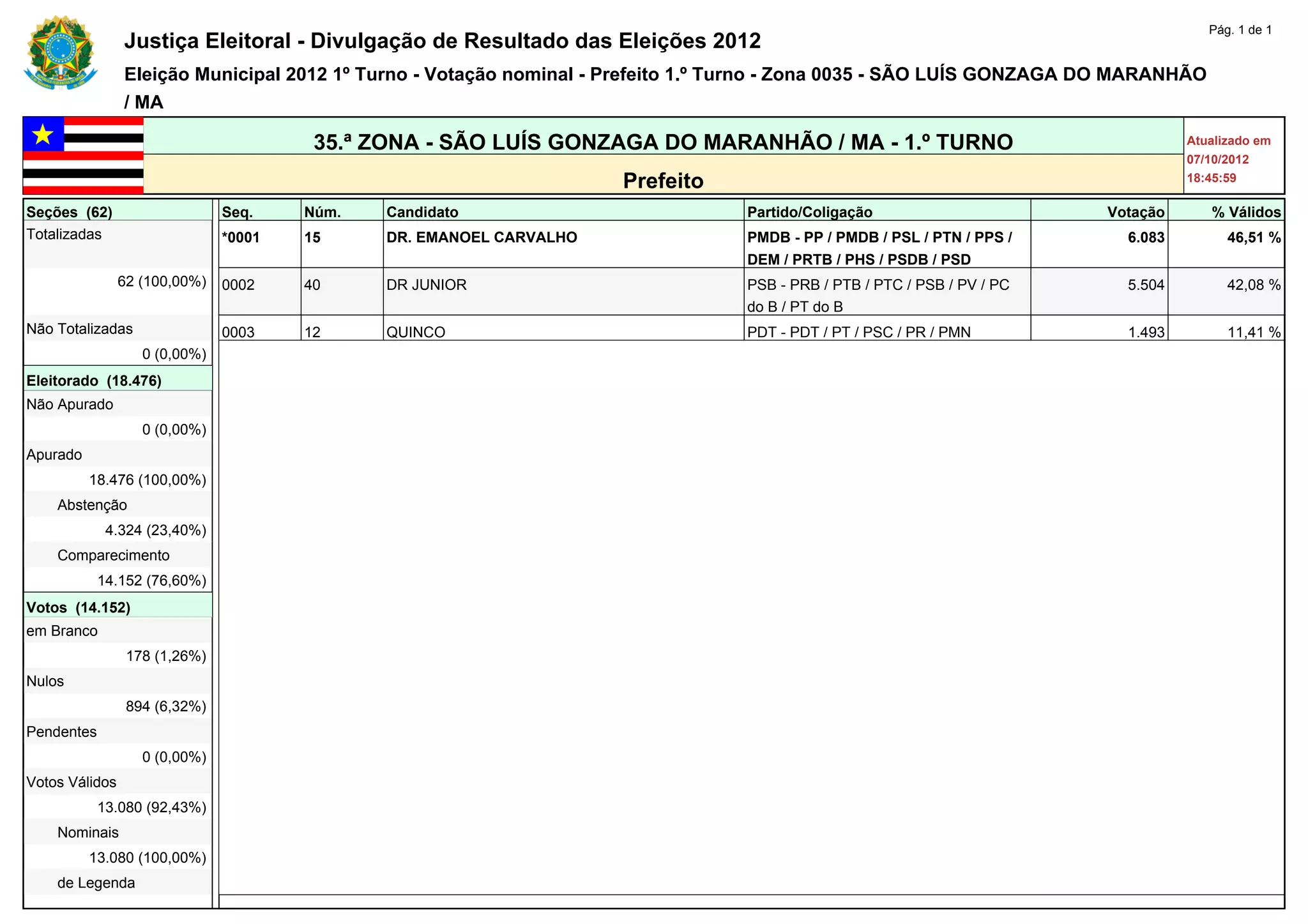 Este documento apresenta os resultados da votação para prefeito no primeiro turno da eleição municipal de 2012 na 35a Zona Eleitoral de São Luís Gonzaga do Maranhão. Dr. Emanoel Carvalho do PMDB recebeu 6.083 votos (46,51% dos válidos), Dr Junior do PSB recebeu 5.504 votos (42,08% dos válidos) e Quinco do PDT recebeu 1.493 votos (11,41% dos válidos). O total de eleitores foi de 18.476, com uma abstenção de 4