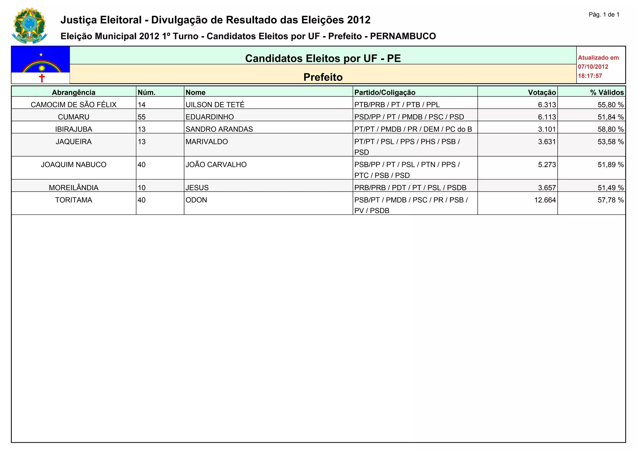 Este documento lista os candidatos eleitos prefeitos em municípios de Pernambuco no 1o turno das eleições municipais de 2012, incluindo seus nomes, partidos/coligações e percentuais de votos válidos. Uilson de Teté foi eleito prefeito de Camocim de São Félix com 55,8% dos votos válidos pelo PTB/PRB.