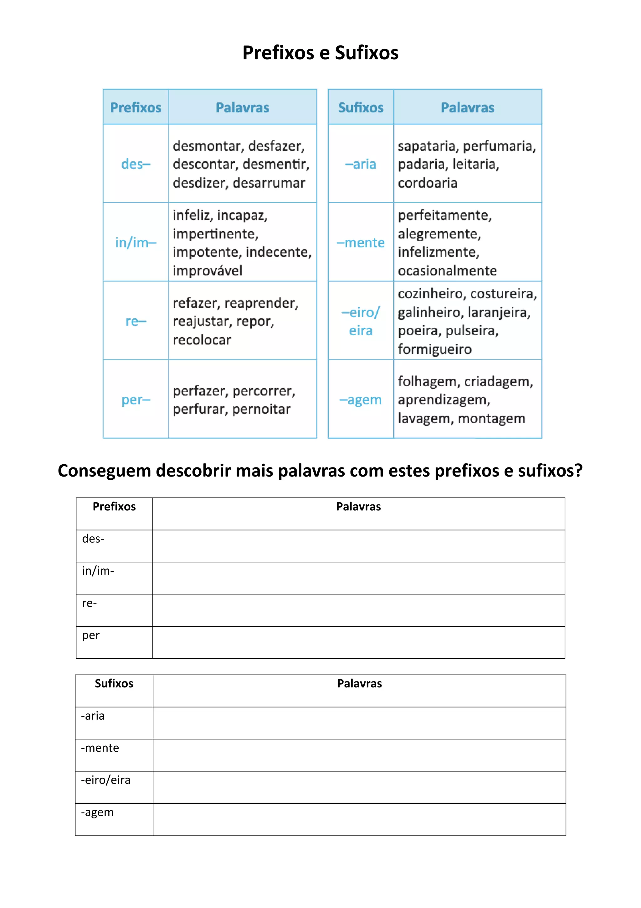 Conseguemdescobrir mais palavras com estes prefixos e sufixos?