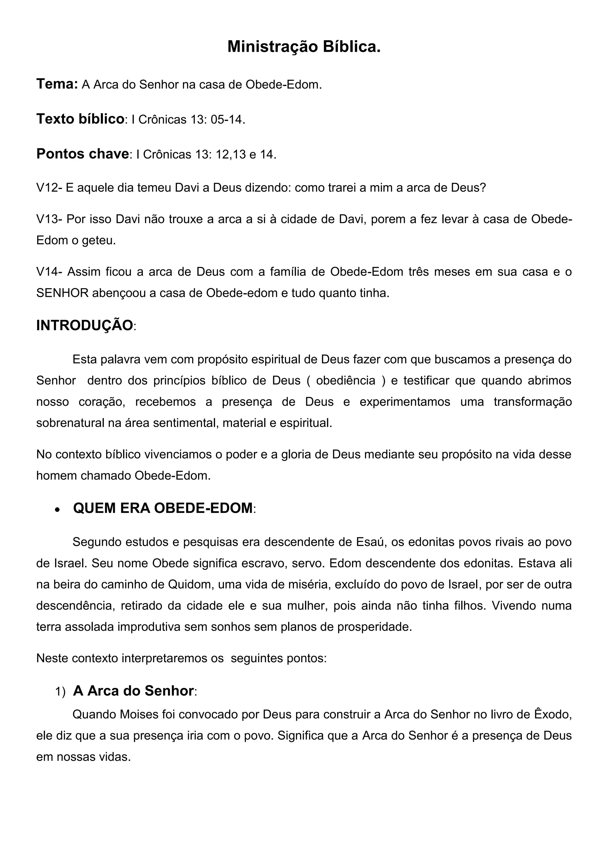 1) A história conta como Davi levou a Arca do Senhor para a casa de Obede-Edom por medo, após um incidente onde Uzá morreu ao tocar na arca.