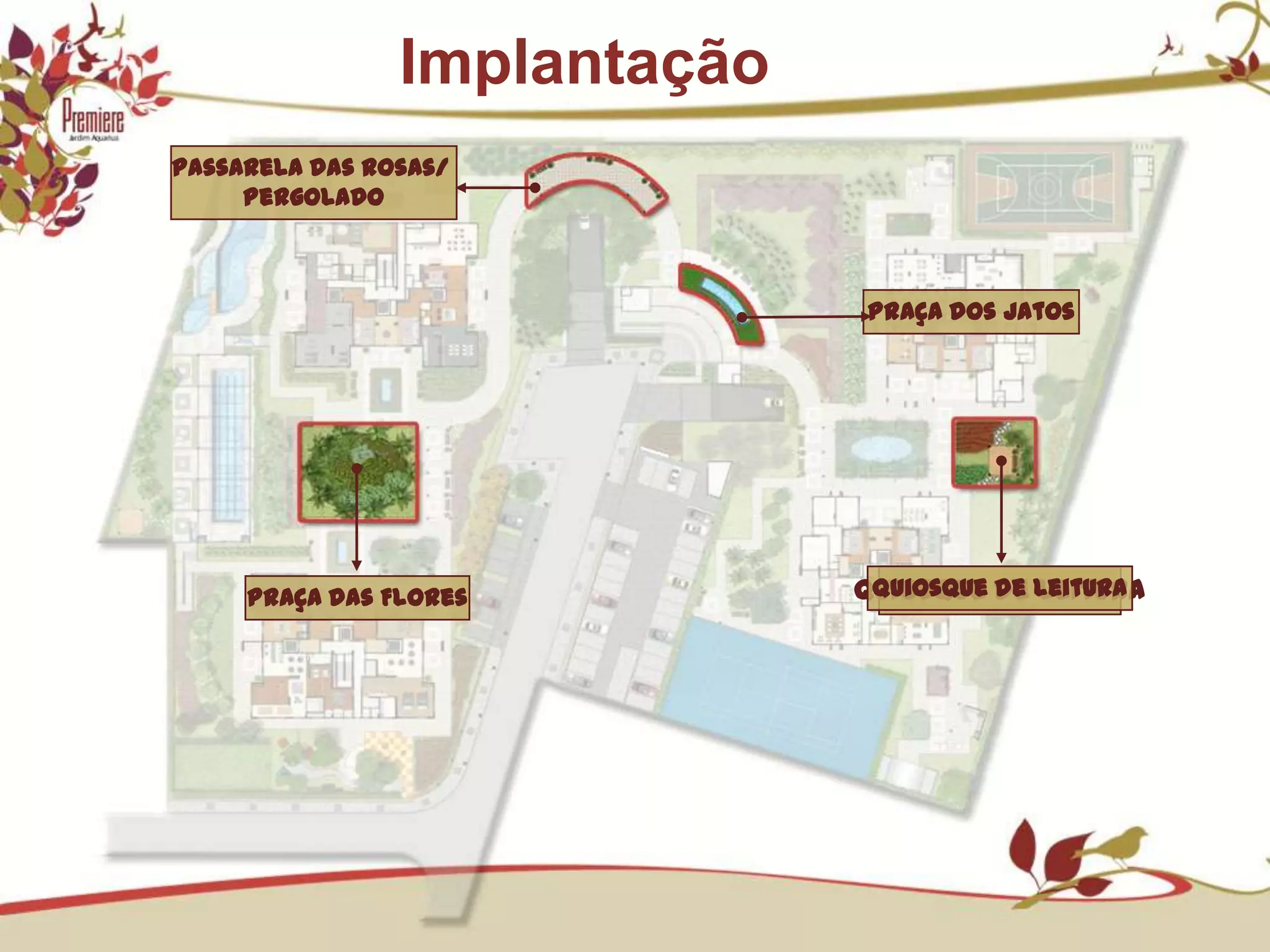 O documento lista elementos de implantação de um empreendimento imobiliário como praças, quiosques, playground e áreas de lazer. Também descreve opções de plantas de apartamentos com diferentes layouts e características de um empreendimento da Tecnisa como medição individual de água e gás, portões de garagem automatizados e sistema de aquecimento a gás para piscinas.