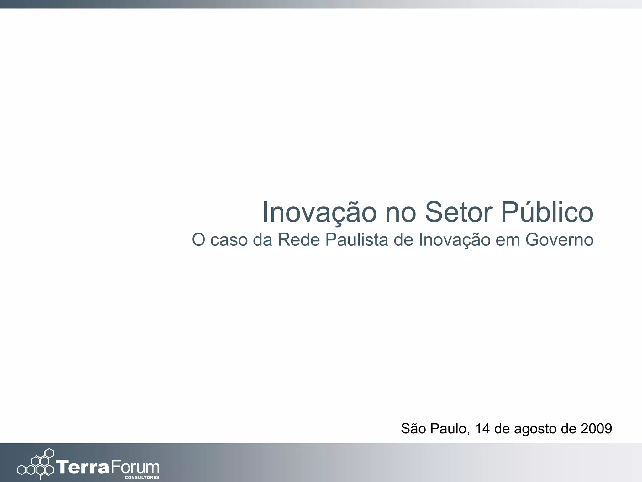 O documento descreve a Rede Paulista de Inovação em Governo, uma rede criada para promover a troca de conhecimento entre servidores públicos em São Paulo através de ferramentas web 2.0. A rede recebeu reconhecimento por seu uso inovador de redes sociais para melhorar a gestão pública e se comunicar com cidadãos.