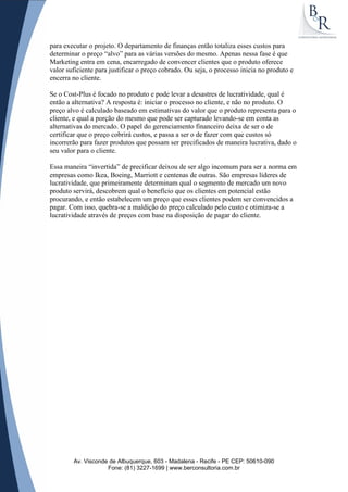 O documento discute os problemas do método de precificação "Cost-Plus" (custo mais margem) e propõe uma abordagem alternativa focada no cliente. O método Cost-Plus leva a preços excessivamente altos ou baixos dependendo do mercado, já que não considera como o volume afeta os custos. Uma abordagem melhor é determinar o valor que o produto representa para o cliente e estabelecer o preço com base nisso.