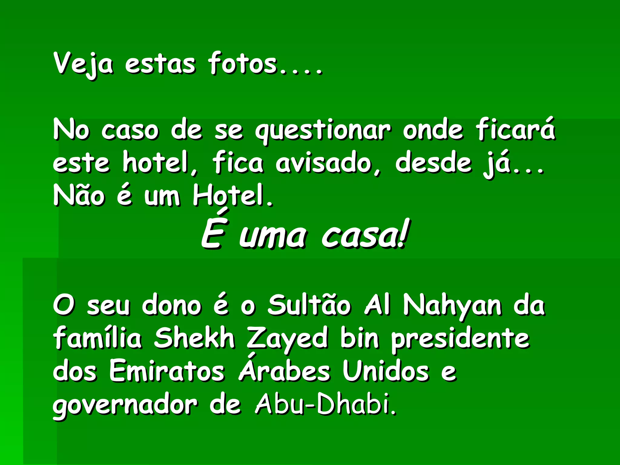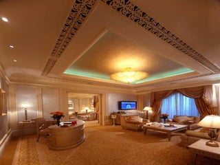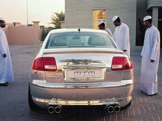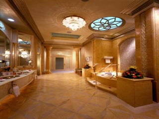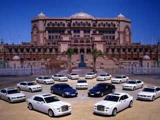 Este documento descreve uma luxuosa casa que pertence ao Sultão Al Nahyan da família real dos Emirados Árabes Unidos. A propriedade não é um hotel, mas sim uma casa particular do Sultão. O documento também menciona um carro Audi A8 prateado feito para o Sultão, que é revestido de prata verdadeira, não pintura.