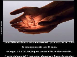 Este documento lista os benefícios de se criar um filho, comparando-os ao custo estimado de R$ 160.140,00 de criar uma criança da classe média até os 18 anos no Brasil. Entre os benefícios listados estão momentos de amor e risos compartilhados, orgulho em ver as conquistas da criança, e receber amor e gratidão em troca mesmo após a criança crescer. O documento conclui que o valor investido em um filho trará recompensas que nenhum outro investimento pode propor
