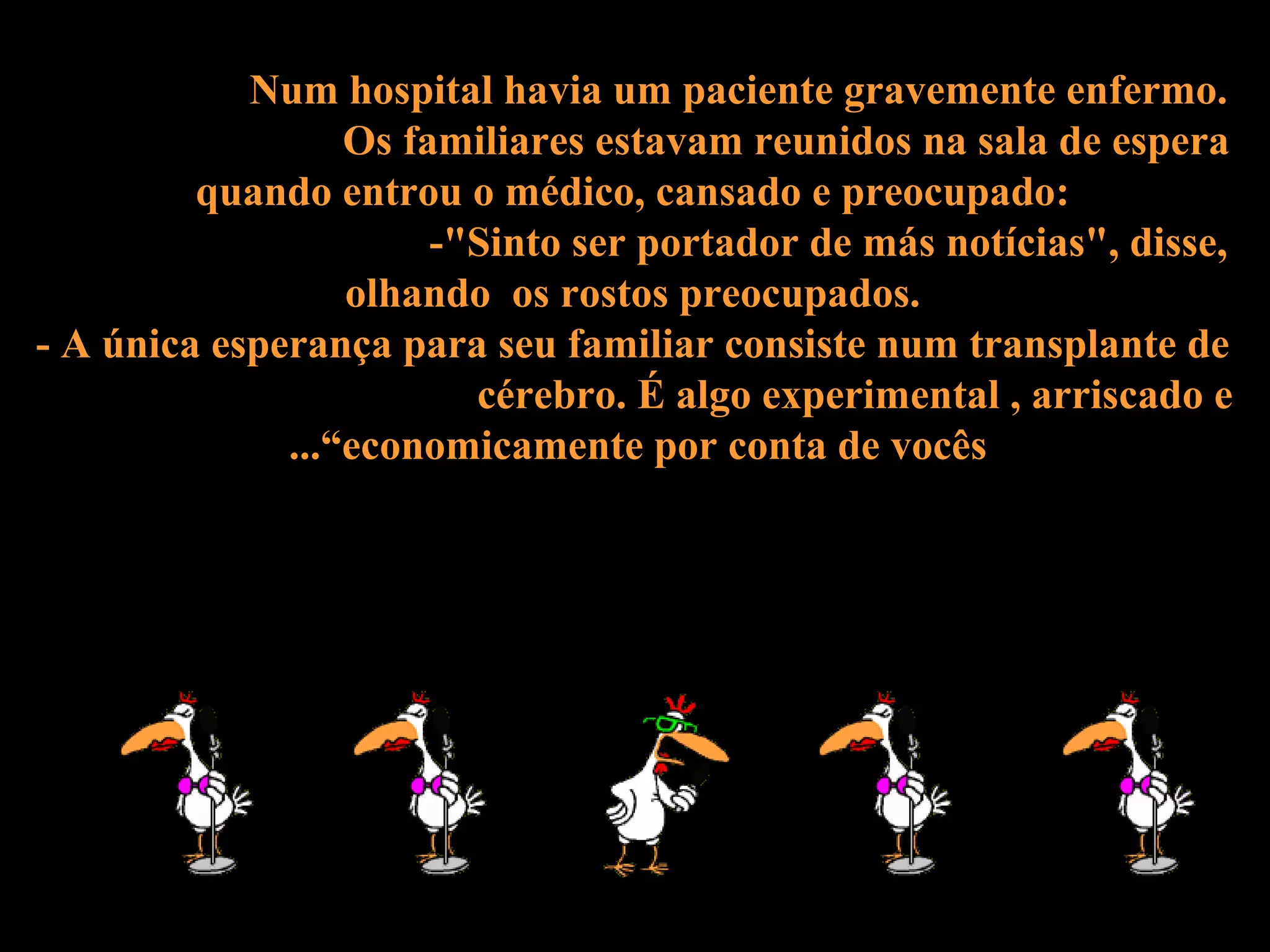 Um médico informa a família de um paciente gravemente doente que seu único tratamento é um transplante de cérebro experimental e caro. Quando perguntado sobre o preço, o médico explica que cérebros de mulheres custam menos porque são os únicos que já foram usados com sucesso.