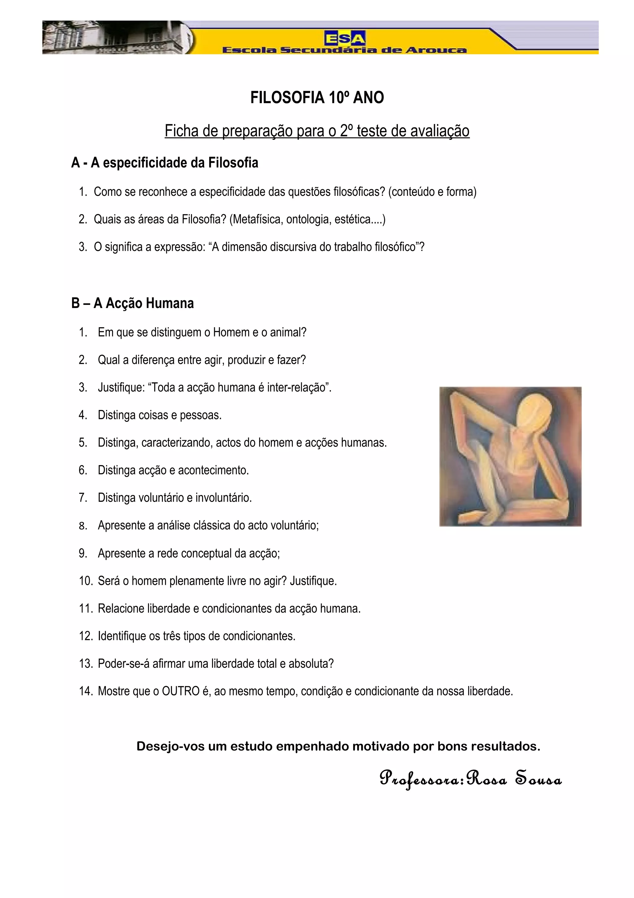 Este documento fornece uma lista de tópicos e perguntas sobre filosofia e ação humana para preparação de um teste. A lista inclui questões sobre as especificidades da filosofia, como se distinguem o homem e o animal, a distinção entre agir, produzir e fazer, e os tipos de condicionantes da ação humana.