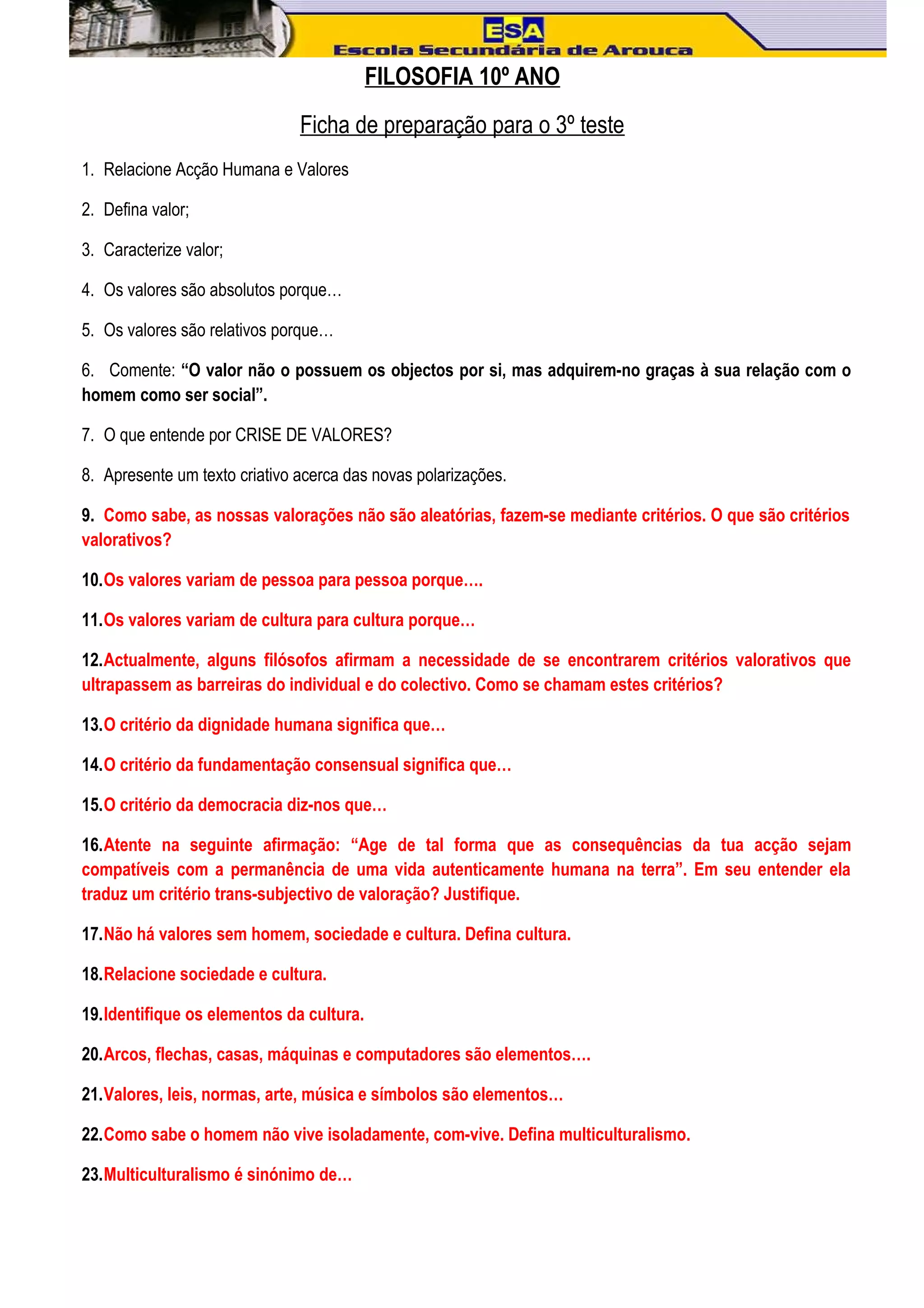 Este documento fornece uma lista de tópicos e questões sobre filosofia para um teste, incluindo definições de valores, cultura e multiculturalismo, assim como critérios valorativos e a dimensão ético-política. Os alunos devem relacionar valores com a ação humana, definir e caracterizar valores, e discutir se são absolutos ou relativos.