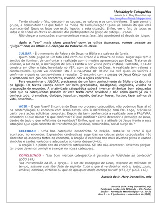 O documento descreve o método VER-JULGAR-AGIR-CELEBRAR para preparar encontros catequéticos de forma efetiva. Ele explica que cada etapa é importante para reflexão sobre a realidade à luz da Palavra de Deus e promover ações concretas e oração. O objetivo é usar dinâmicas criativas que levem os catequizandos a uma experiência significativa da fé.
