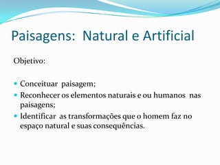 Este documento fornece uma sequência didática para ensinar sobre paisagens naturais e artificiais para alunos de 5a série. A sequência inclui perguntar aos alunos sobre o que sabem sobre paisagens, desenhar uma paisagem natural no Paint identificando seus elementos, adicionar um elemento da internet transformando a paisagem em artificial, e criar uma animação no Movie Maker.