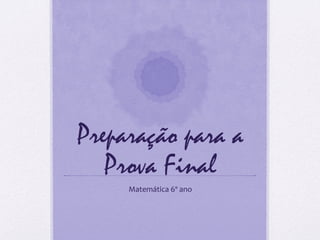 Este documento fornece um teste de matemática com 23 questões para preparação para uma prova final de 6o ano. O teste cobre tópicos como média, porcentagem, geometria, álgebra e razão e proporção. As questões variam de cálculos numéricos a identificação de figuras geométricas e propriedades.