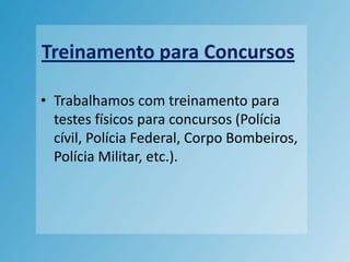 Este documento descreve um treinamento para concursos públicos que se especializa em preparar candidatos para os testes físicos dessas seleções, trabalhando de acordo com as necessidades individuais para obter bons resultados e elaborando programas focados nos requisitos específicos de cada prova.