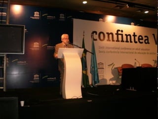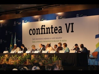 O documento descreve os objetivos e processo preparatório da CONFINTEA VI, que incluiu conferências regionais nas Américas, Ásia, África, Europa e Estados Árabes. Os objetivos foram impulsionar o reconhecimento da educação de adultos, enfatizar seu papel no desenvolvimento e renovar o compromisso político com a implementação de instrumentos para passar da retórica à ação. A sociedade civil organizou advocacy para defender o direito à educação, alfabetização, migração e combate à pobreza.