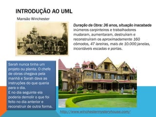 A Mansão Winchester é uma casa inacabada construída por 36 anos na Califórnia, com projetos constantemente mudados e reconstruídos sem um plano definido, levando a mais de 10.000 janelas e 47 lareiras em cerca de 160 cômodos. O documento introduz também os principais criadores da UML e explica que a UML permite modelar sistemas de forma padronizada através de diagramas.