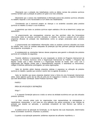 Este documento é um decreto presidencial que promulga a Convenção no 170 da Organização Internacional do Trabalho (OIT) relativa à segurança na utilização de produtos químicos no trabalho. O decreto considera que a convenção foi assinada em 1990 e aprovada pelo Brasil em 1995, entrando em vigor internacionalmente em 1993 e para o Brasil em 1997. O decreto estabelece que a convenção deve ser cumprida integralmente no Brasil.
