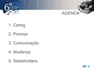 O documento discute a gestão de stakeholders no programa Premiar da Cemig, resumindo: 1) O programa visa melhorar a qualidade do fornecimento de energia reduzindo interrupções causadas por árvores; 2) A comunicação e engajamento de stakeholders como moradores é essencial para o sucesso do programa; 3) O gerenciamento do conhecimento é importante para disseminar as melhores práticas do programa.