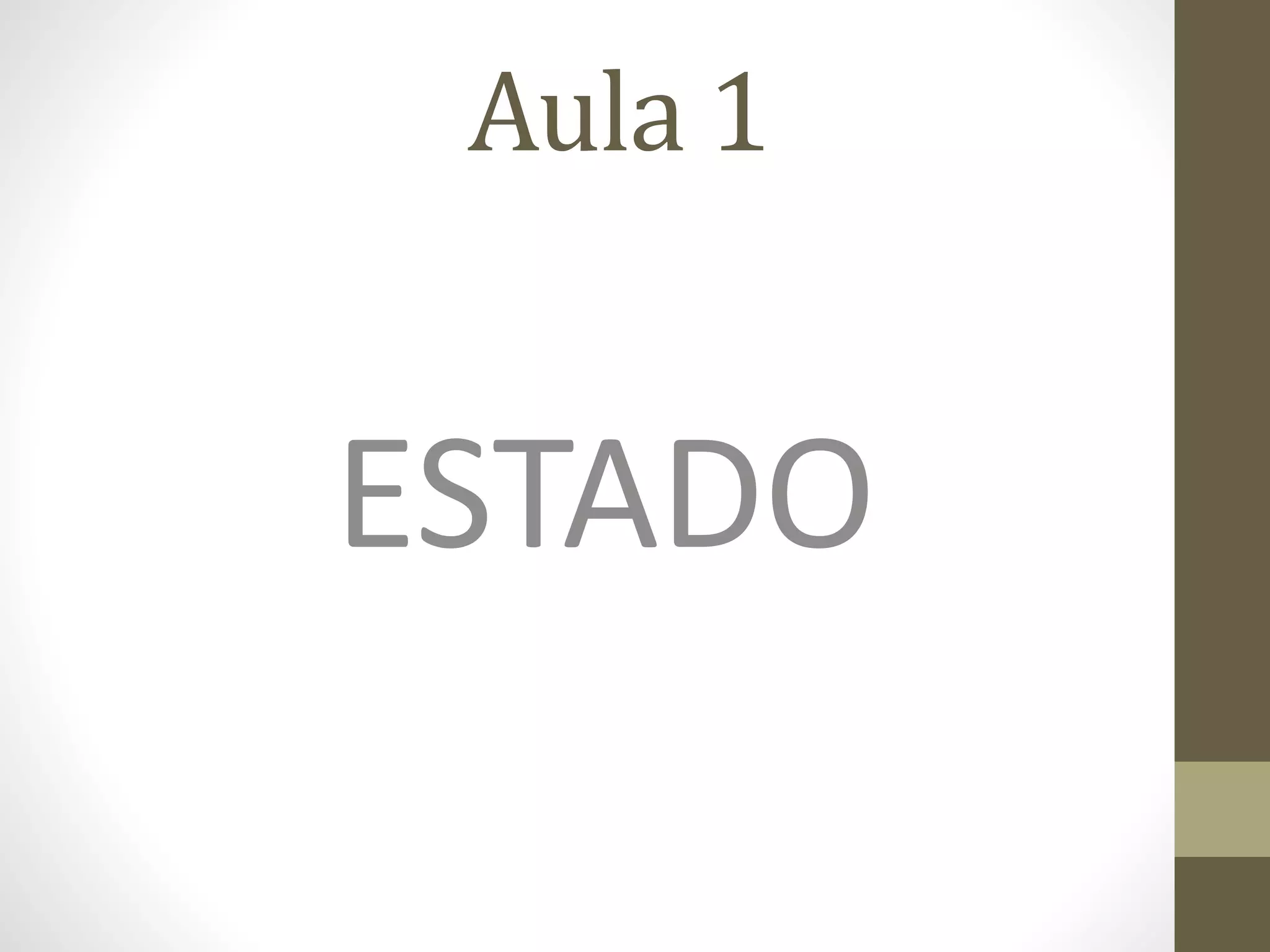 O documento define o Estado como uma sociedade política formada por grupos de indivíduos unidos e organizados permanentemente para realizar um objetivo comum de bem público, dentro de um território determinado e com governo próprio. O Estado busca a ordem e defesa social através de meios que variam de acordo com a cultura, época e costumes, exercendo autoridade e poder sobre os governados.