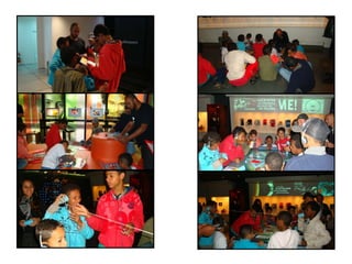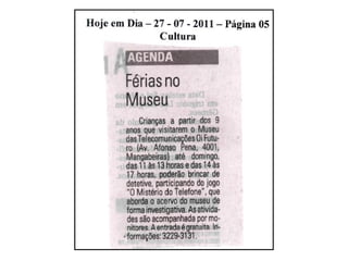 O documento descreve um jogo educativo realizado no Museu de Telecomunicações em duas cidades brasileiras, Rio de Janeiro e Belo Horizonte, entre 19 de julho e 31 de julho. O jogo ensinou crianças sobre o acervo do museu de forma lúdica, por meio de pistas e desafios. Participantes e seus responsáveis deixaram comentários positivos sobre a atividade.