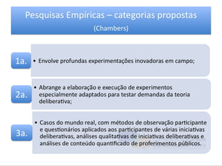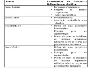 O documento discute os princípios e dimensões da democracia deliberativa, incluindo a superação de uma visão agregativa centrada no voto, a transferência do foco para a justificação de valores e preferências, e a construção institucional inclusiva. Também aborda a reciprocidade como princípio central, envolvendo a troca de razões para declarar leis como legítimas e justas, assim como a provisoriedade das leis e procedimentos.