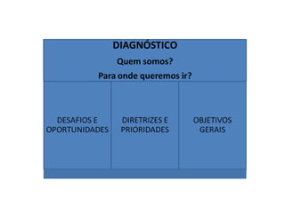O documento apresenta o planejamento do Conselho Municipal de Preservação Histórica e Cultural de Camaquã, destacando seu papel propositivo na valorização do patrimônio e no desenvolvimento participativo da cidade. São abordados diagnósticos, desafios, oportunidades e objetivos para a preservação e identificação dos patrimônios locais, além de estratégias para articular políticas públicas e promover a educação socioambiental. Entre os objetivos estão a identificação de patrimônios, a garantia de sua preservação e a construção de uma rede de preservação colaborativa.