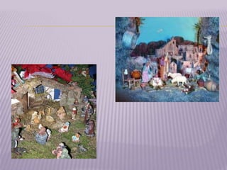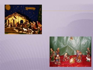 O documento descreve a história do presépio, representando o nascimento de Jesus em Belém. Fala sobre como os primeiros presépios surgiram na Itália no século XVI para representar a Natividade de forma plástica e teatral. Também lista as figuras comuns em um presépio, como Jesus, Maria, José e os animais em volta.