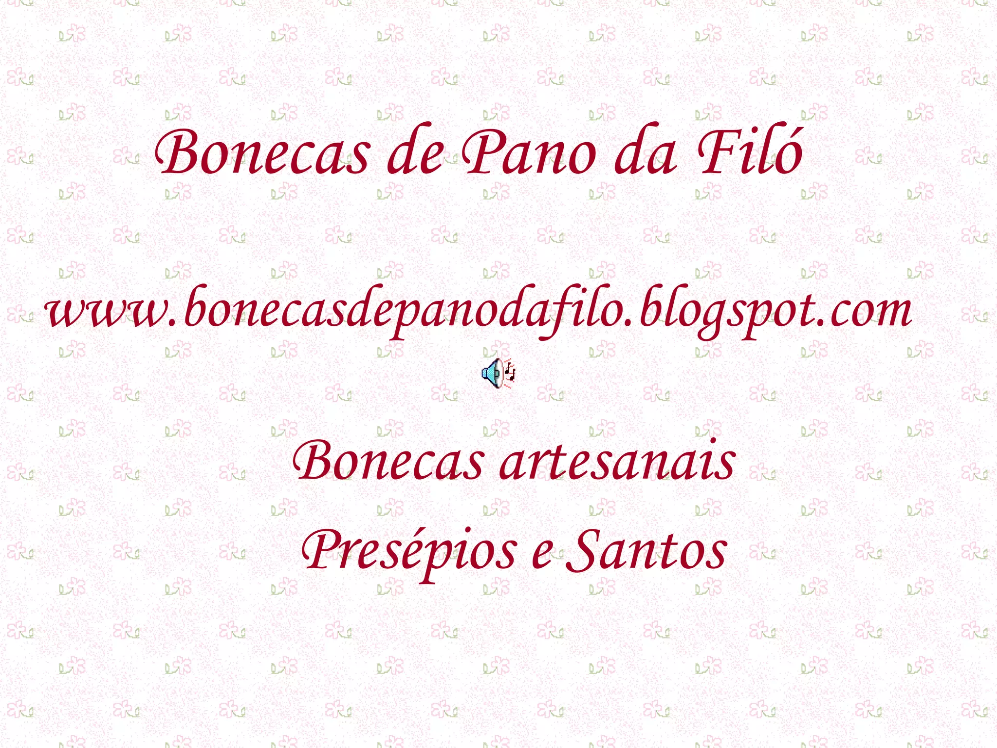 Este documento promove bonecas de pano feitas artesanalmente, incluindo presépios e santos. Fornece detalhes sobre como adquirir as bonecas, seja visitando o ateliê em Lisboa, fazendo encomendas por telefone ou e-mail, ou recebendo por correio.