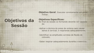 Este documento apresenta uma formação sobre o press de ombros, incluindo o objetivo geral de executar corretamente o exercício, as técnicas corretas para a realização do exercício, como ajustar o banco e como alongar os músculos após.