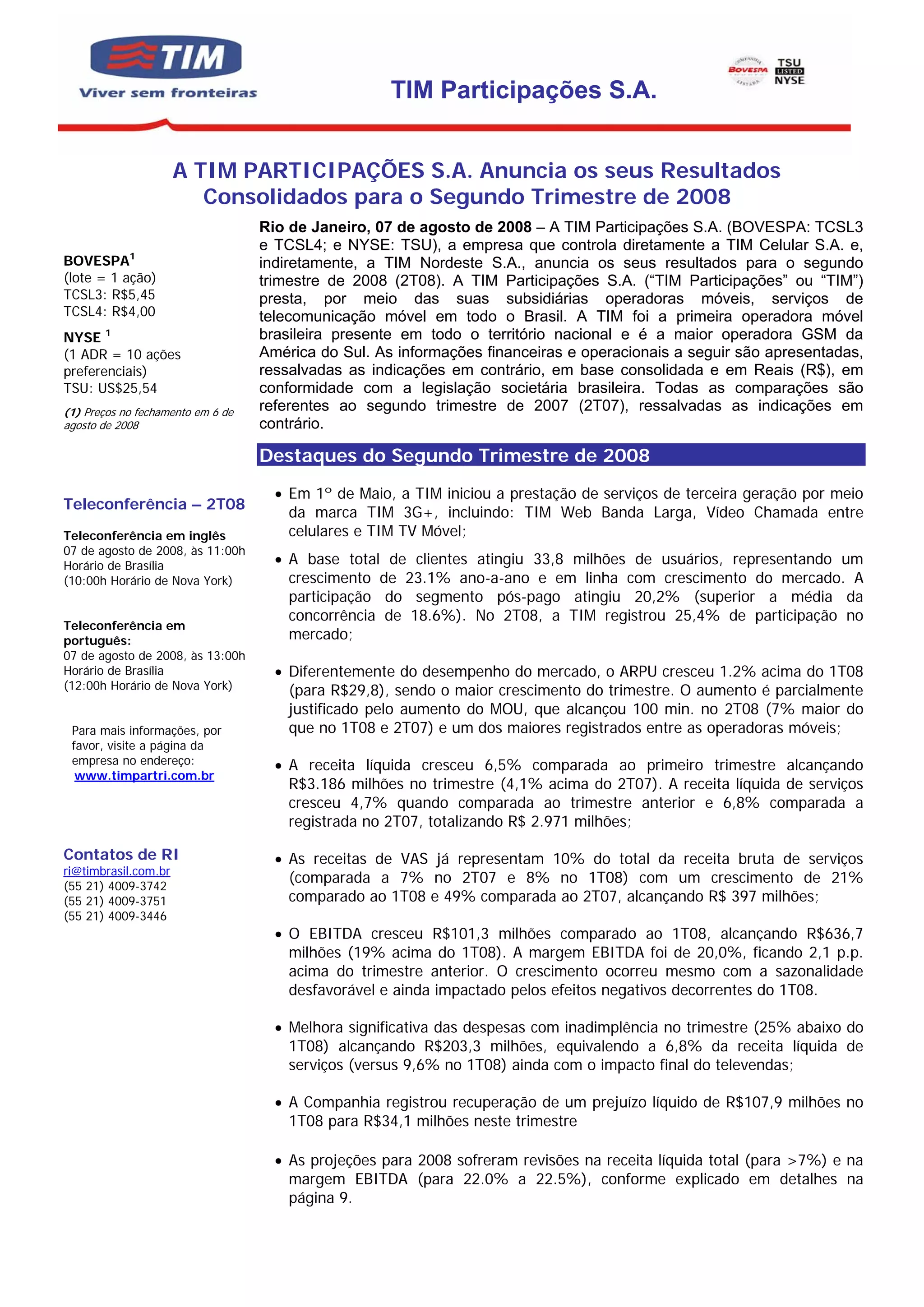 1) A TIM Participações anuncia seus resultados financeiros e operacionais para o segundo trimestre de 2008, com destaque para o crescimento da base total de clientes para 33,8 milhões e do lançamento do serviço TIM 3G+ em 1o de maio.