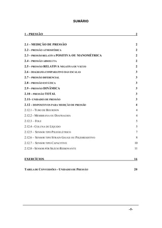 O documento discute os princípios e métodos de medição de pressão, incluindo escalas de pressão, unidades de medida e dispositivos como tubos de Bourdon, membranas, colunas de líquido e sensores piezoelétricos, strain gauge e capacitivos. É fornecida uma explicação detalhada sobre como cada dispositivo funciona para medir pressão.