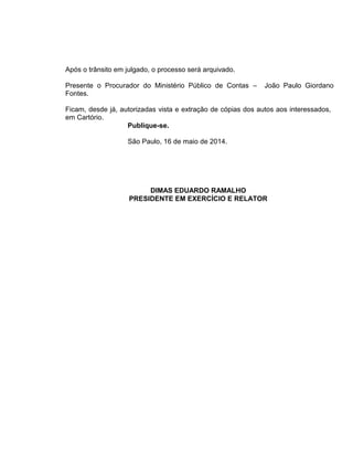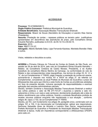 O Tribunal de Contas do Estado de São Paulo julgou irregular a prestação de contas da Associação Missões Transculturais Shekinah referente a repasses públicos recebidos em 2010 da Prefeitura de Guarulhos no valor de R$277.731,07. A associação foi condenada a restituir os valores aos cofres públicos e ficará proibida de receber novos repasses enquanto a dívida não for quitada. O prefeito à época e o presidente da associação também foram multados em 200 UFESPs cada um