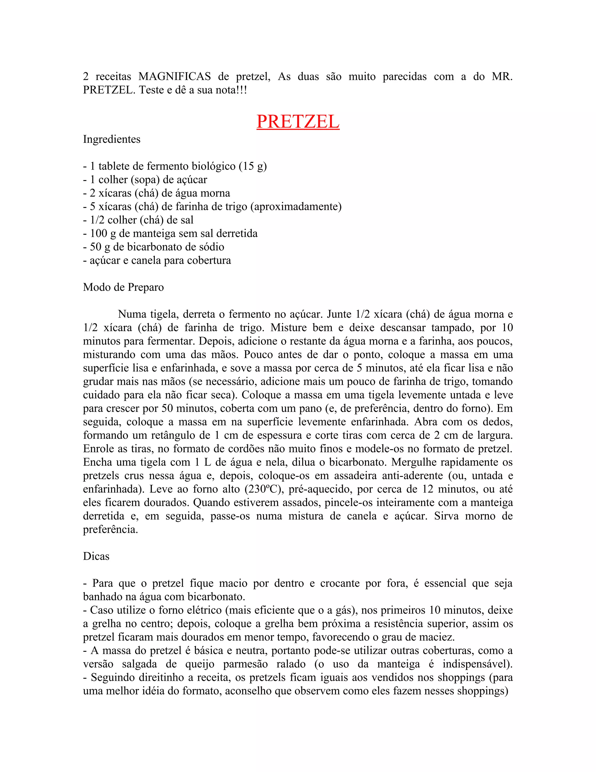 O documento fornece duas receitas de pretzel. A primeira receita inclui fermento biológico, farinha de trigo, sal, manteiga e bicarbonato de sódio. A massa é moldada em formato de pretzel, mergulhada em água com bicarbonato e assada com cobertura de manteiga e açúcar com canela. A segunda receita substitui o fermento biológico por fermento para pão e acrescenta leite, ovo e manteiga à massa.