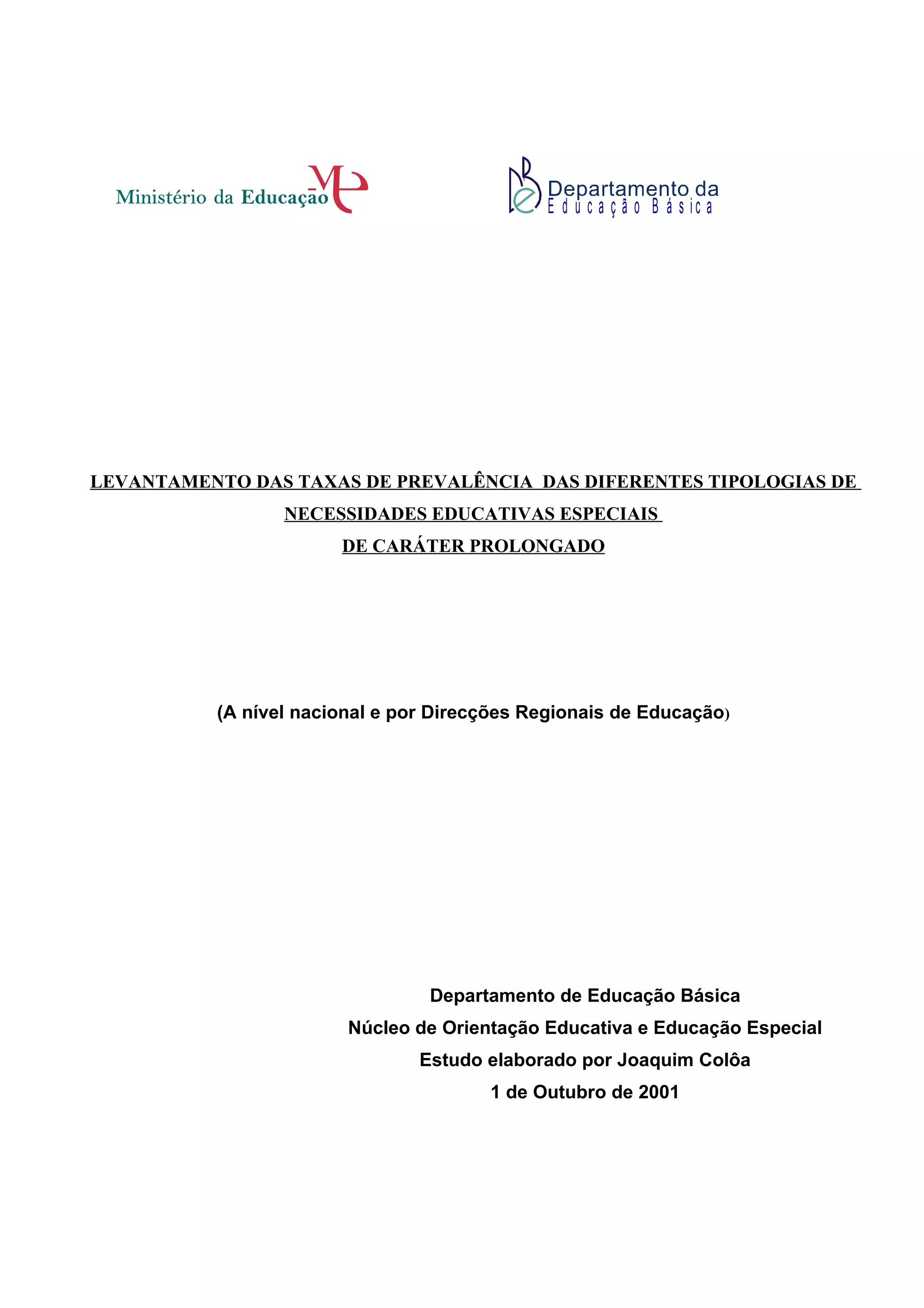 Este documento apresenta as taxas de prevalência de alunos com necessidades educativas especiais de caráter prolongado em Portugal continental entre 1997-2001. Os dados são apresentados por domínio (audição, visão, motor, cognitivo, fala/linguagem/comunicação e emocional/personalidade) e por Direção Regional de Educação. As taxas variam entre 13.2 a 22.2 alunos com necessidades especiais por cada mil alunos matriculados, dependendo da região. O documento descreve também a metodologia e conceitos utiliz
