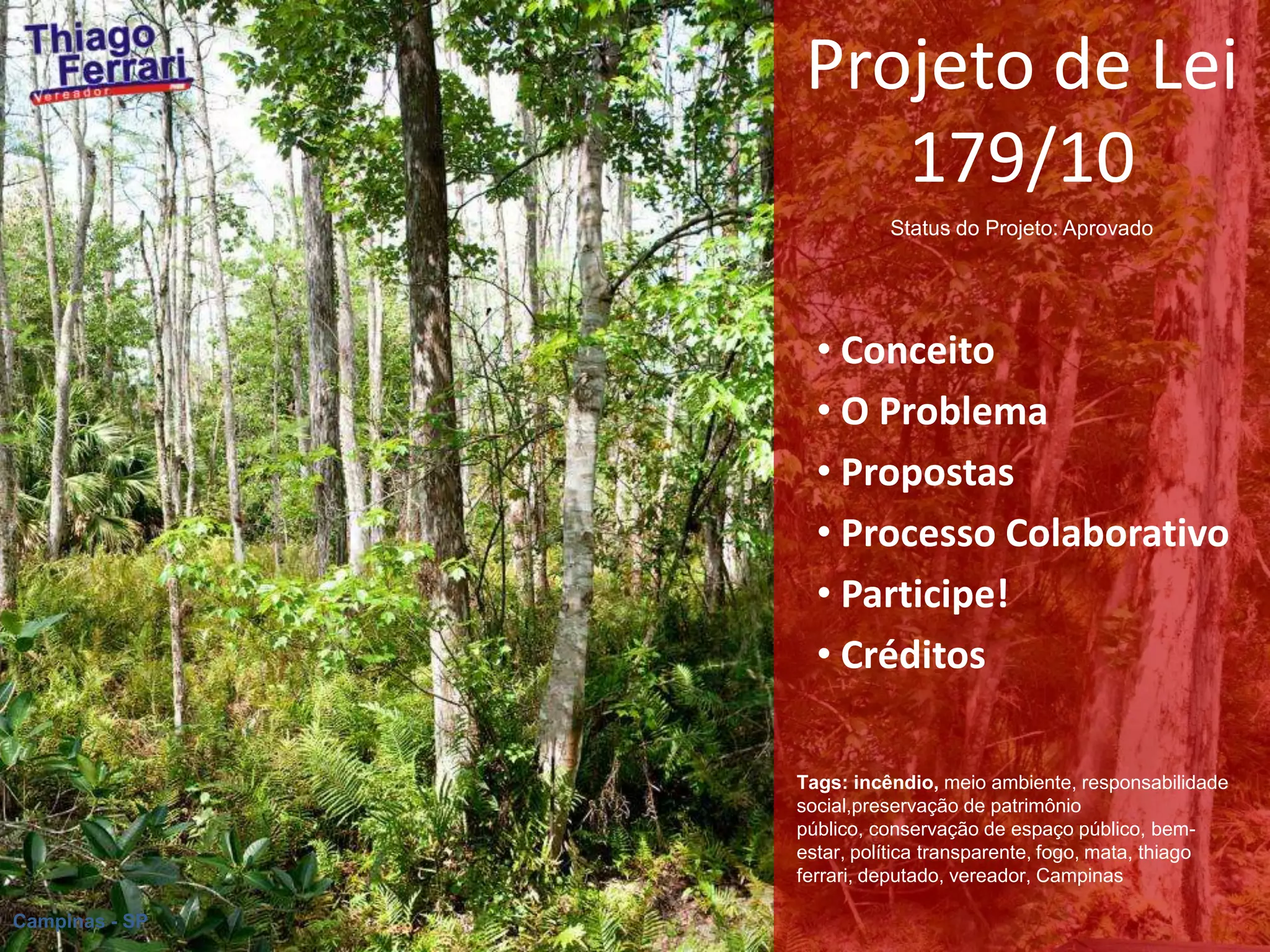 O projeto de lei 179/10, aprovado, institui um programa de prevenção a incêndios nas Áreas de Proteção Ambiental e parques municipais de Campinas para preservar a qualidade de vida e a riqueza natural da cidade. O projeto teve participação da comunidade por meio das redes sociais e visa dar maior eficiência às ações da prefeitura e órgãos ambientais.