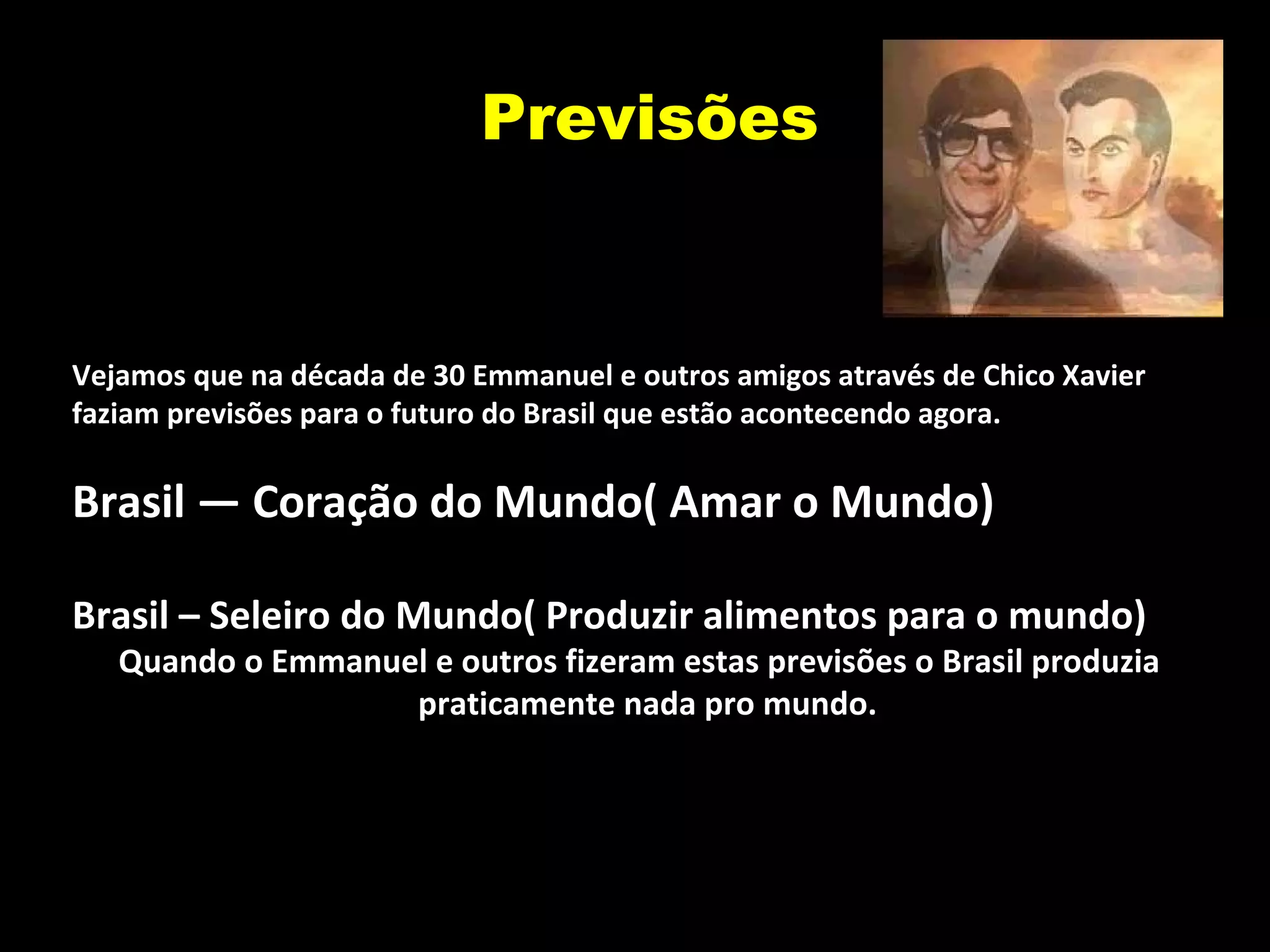 O documento discute previsões feitas por Emmanuel e Chico Xavier na década de 1930 sobre o Brasil se tornar o "Coração do Mundo" e o "Seleiro do Mundo", produzindo alimentos para o mundo. Também critica o desperdício e consumismo excessivo e defende que, em vez de culpar os produtores, devemos ajudá-los e mudar nossos hábitos.