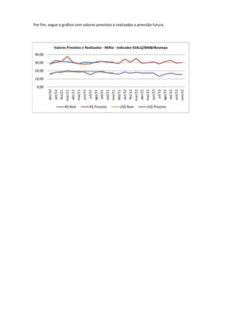 O relatório apresenta previsões de preços do milho para os próximos 12 meses em reais e dólares, com cenários pessimista, provável e otimista. Fornece uma tabela com os valores previstos para cada mês e variação em relação ao mês anterior, além de um gráfico comparando valores previstos e reais dos últimos 12 meses e a previsão futura.