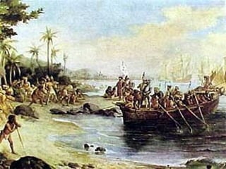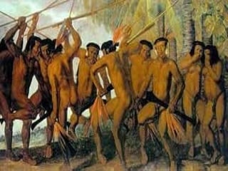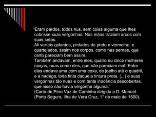 1) O documento descreve os primeiros contatos entre os portugueses e os povos indígenas no Brasil em 1500.