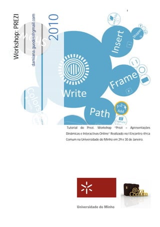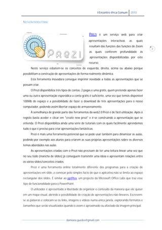 Este documento fornece instruções sobre como usar a ferramenta Prezi para criar apresentações dinâmicas. Detalha os recursos principais do Prezi como a navegação por zoom, a criação de trilhas para guiar a apresentação e dicas para escrever texto e adicionar outros elementos.