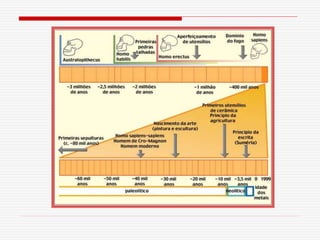 Os primeiros seres humanos evoluíram na África há milhões de anos e incluíam espécies como o Australopithecus e o Homo habilis. Ao longo do tempo, desenvolveram a capacidade de andar em duas pernas, usar ferramentas e dominar o fogo. Posteriormente, a domesticação de animais e o cultivo de plantas permitiu a sedentarização e o surgimento das primeiras aldeias.
