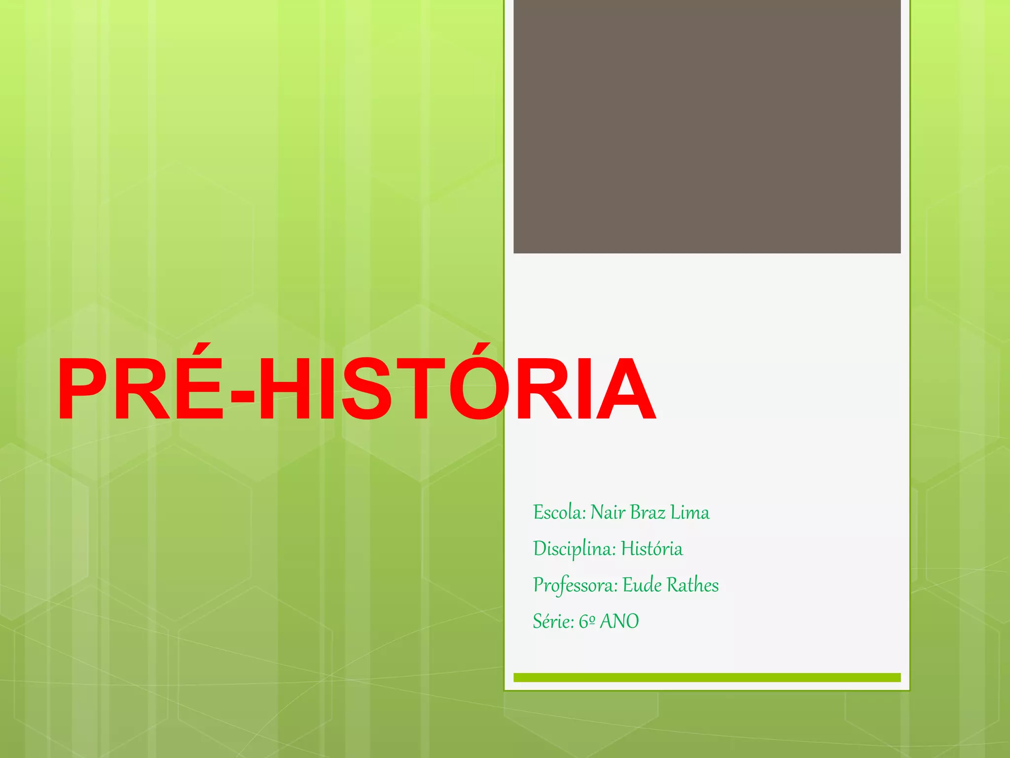 - A Pré-história é dividida em Paleolítico e Neolítico, períodos onde os seres humanos desenvolveram ferramentas de pedra, fogo e caça/pesca no Paleolítico, e agricultura, cerâmica e comércio no Neolítico.