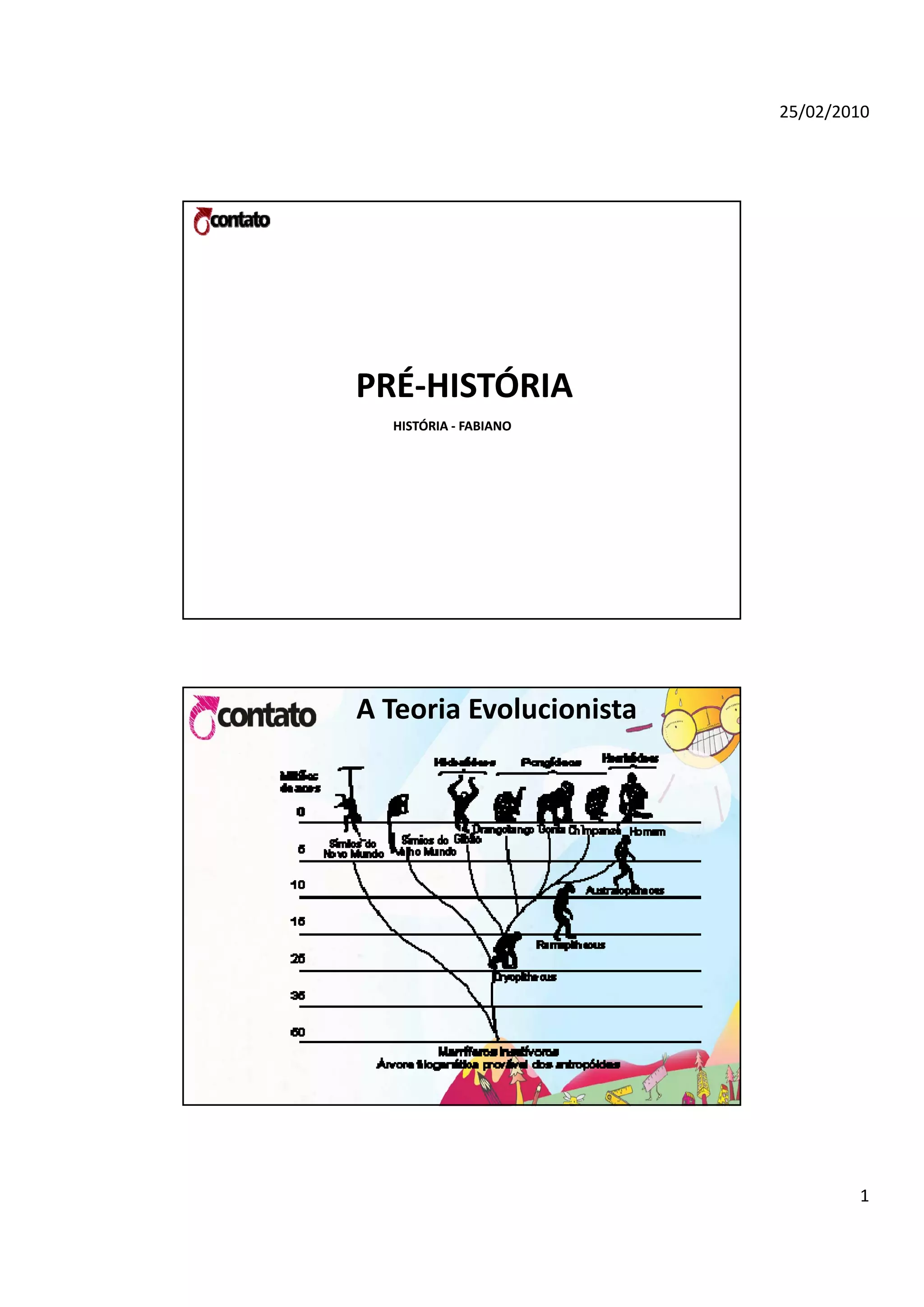 O documento descreve a evolução da espécie humana desde os primeiros hominídeos como o austrolopitecus até o Homo sapiens moderno, destacando marcos como o uso de ferramentas e fogo pelo Homo erectus e o avanço intelectual do Homo sapiens. Também resume invenções e desenvolvimentos culturais ao longo da pré-história, como agricultura, cerâmica, metalurgia e as primeiras cidades surgidas ao redor de rios como o Nilo e o Eufrates.