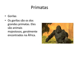 Os gorilas são os maiores primatas, animais majestosos encontrados na África. O gibão é o menor primate conhecido pelos humanos, com os machos atingindo 90 centímetros de altura e pesando entre 5,5 e 9 quilos.