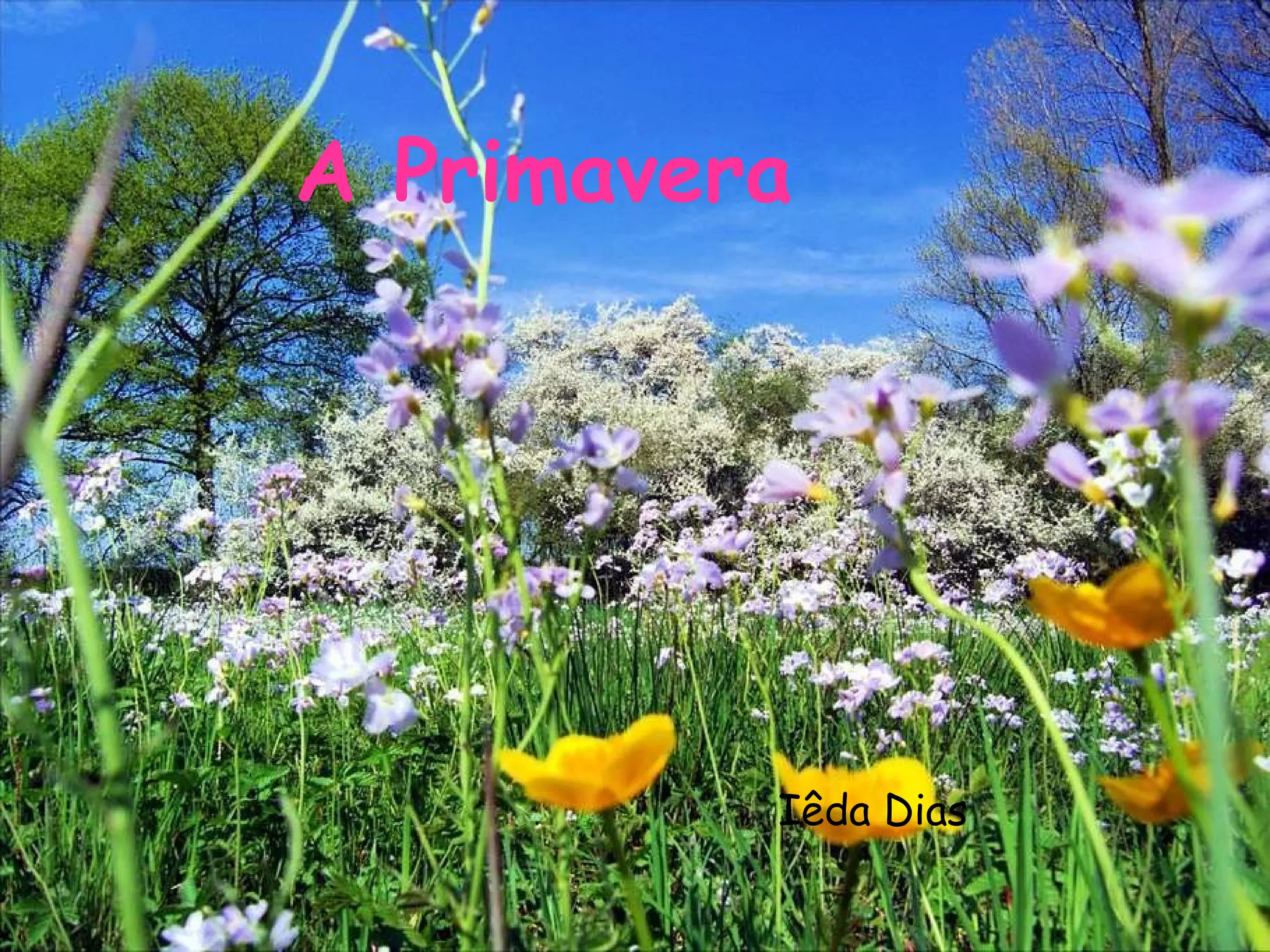 O documento descreve a primavera com flores como rosas vermelhas e jasmim branco no jardim, colibris voando e beijando dálias, borboletas pintando com saltos e piruetas, um bem-te-vi e um sabiá cantando na rama de um manacá, e uma brisa suave levando a canção dos pássaros pelo caminho.