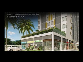 Este documento descreve um projeto imobiliário comercial localizado em uma área estratégica com fácil acesso. O projeto consiste em um edifício de 10 andares com lojas e salas comerciais de diferentes tamanhos, estacionamento e infraestrutura para atender diversos tipos de negócios. As unidades comerciais poderão ser adaptadas de acordo com as necessidades dos compradores e locatários.