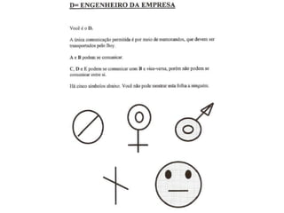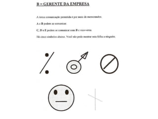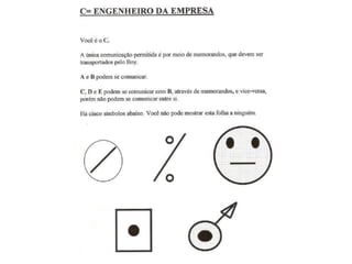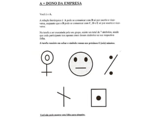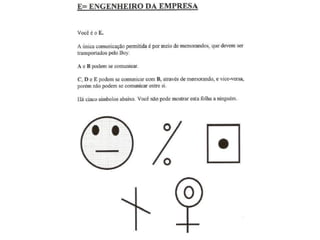 O documento descreve a criação de uma empresa burocrática fictícia em uma atividade de sala de aula. Os participantes foram divididos em equipes representando donos, gerentes e engenheiros dentro de uma estrutura hierárquica. As equipes inicialmente se sentiram perdidas, confusas e inúteis ao tentarem realizar uma tarefa dentro do prazo estabelecido devido às restrições burocráticas. Posteriormente, ao adotarem uma abordagem mais participativa e comunicativa, completaram com sucesso a tarefa.