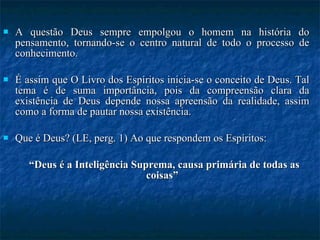 A Doutrina Espírita define Deus como a Inteligência Suprema, causa primária de todas as coisas. Deus não é o infinito, pois seria definir uma coisa por outra que também não é conhecida. A existência de Deus é demonstrada pela ordem e harmonia do universo, que revelam uma inteligência superior à do homem. Amar a Deus e ao próximo resumem a lei espírita e constituem a essência divina.