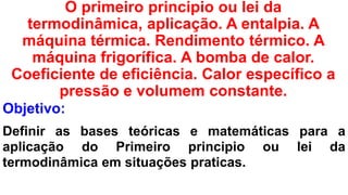 2) A primeira lei da termodinâmica é explicada, incluindo conceitos como energia interna, trabalho e calor.