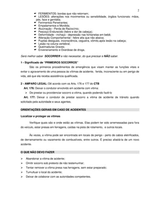 [1] O documento fornece instruções sobre primeiros socorros, incluindo como reconhecer emergências médicas, avaliar vítimas, manter sinais vitais, e realizar respiração boca-a-boca ou outros procedimentos até a chegada de ajuda médica qualificada.